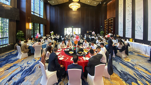 乔迁揭牌仪式后,韩总裁在五星酒店台州远洲凤凰山庄筵开7席,款待各位嘉宾和全体员工。宾主共同举杯,祝台州万乘乔迁大吉,业绩长虹,财源广进。