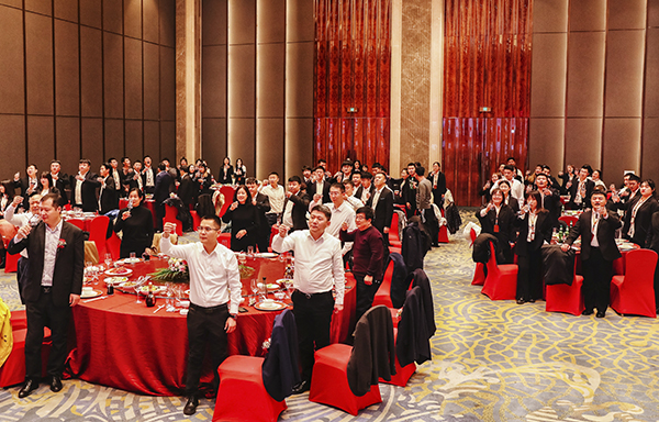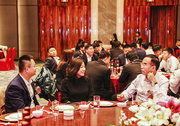 晚上6时许,韩总裁在五星酒店——唐山香格里拉大酒店大宴会厅筵开10席,为唐山分公司庆功。脱下战袍,洗去征尘的90多名员工喜气洋洋,欢声笑语,荟聚一堂,共度荣耀之夜。
